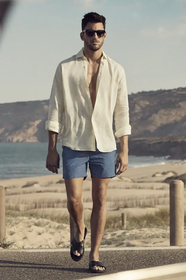 Embrace the tropical spirit of the beach with a short-sleeve shirt in vibrant island prints paired with swim shorts. Tropical prints instantly exude vacation vibes and are perfect for a day of fun in the sun. Opt for swim shorts that dry quickly and have functional pockets. This outfit is perfect for those who want to make a bold statement with their beach style. Discover the ultimate collection of men’s beach outfits for the season, providing a valuable Source of Knowledge on how to maintain a cool and stylish look while enjoying the sun and surf.